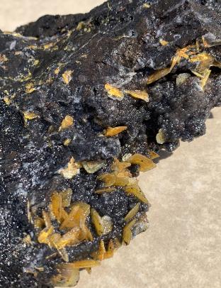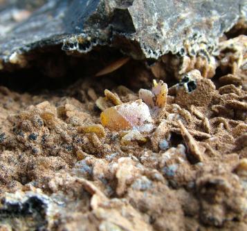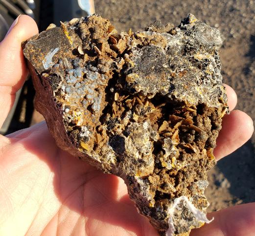 | Each year when I go to the Tucson show I always go out and do some digging. This year I went to the Finch Mine in Hayden, Arizona and a few other places. Although I am going out of order a little bit, I will start with the Finch Mine. The Finch Mine has Wulfenite crystals that vary in color. These range from the typical "Butterscotch" color to Tan, pure yellow, red and orange. The clarity of the crystals varies from a gemmy transparent to completely opaque. The wulfenite crystals sometimes are completely to partially covered with a sparkling cryptocrystalline chalcedony druze. Sometimes vividly colored wulfenite crystals grow on a sharply contrasting black druse and in bright lighting these are phenomenal. The wulfenite crystals - the ones that are not covered and reinforced with a chalcedony coating - are very delicate, fragile and brittle. It is very hard to get the uncoated wulfenite crystal specimens out without damage and chipping/breakage. The thicker the coating the more resistant the wulfenite is to damage but the problem with that is that the wulfenite is harder to distinguish as the coating thickness increases. |