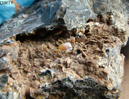 | Below: Freshly-dug dirty wulfenite crystals from the Fine Mine in Hayden, Arizona. This is a front and back view of the same specimen. The appearance varies between the two sides, with one side having a black druse coating. |