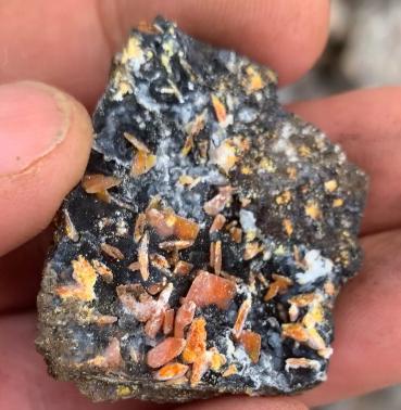 | At left is seen a nice specimen of Finch Mine wulfenite crystals. This specimen is still dirty and will look fantastic once cleaned. These have a very thin chalcedony coating. |