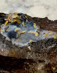 | Below left: Heavy chalcedony over wulfenite crystals. Below right.: Light chalcedony coating on yellow wulfenite crystals on a sparkling black druze matrix. |