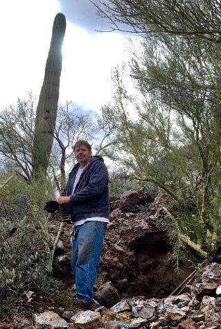 | After figuring out where the mine was located we spent a couple of hours looking for wulfenite. I wasted a lot of energy breaking rocks with no joy. Then I found a place that had fantastic wulfenite crystals! The terrain here is steep and cactus of every kind seemed to be spaced about every four inches apart! Here (at left) is the digging area and as you can see, sharp angry cactus was everywhere. In the distance just up the hill was a saguaro that must have been 25 foot tall. Swinging a sledge hammer with cactus poking me from all directions will not be something that I soon forget! The elevation at the mine is about 2,400 feet, so not too bad, but not the 500 feet oxygen level that I am used to. |