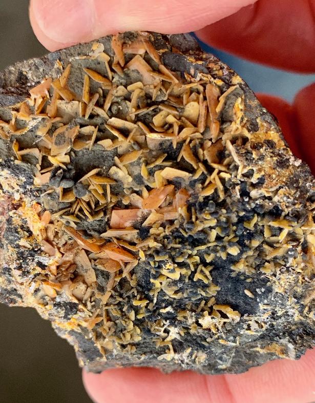 | Expand above 2x to see the micro-crystals. I think the acicular clear crystals are selenite? |