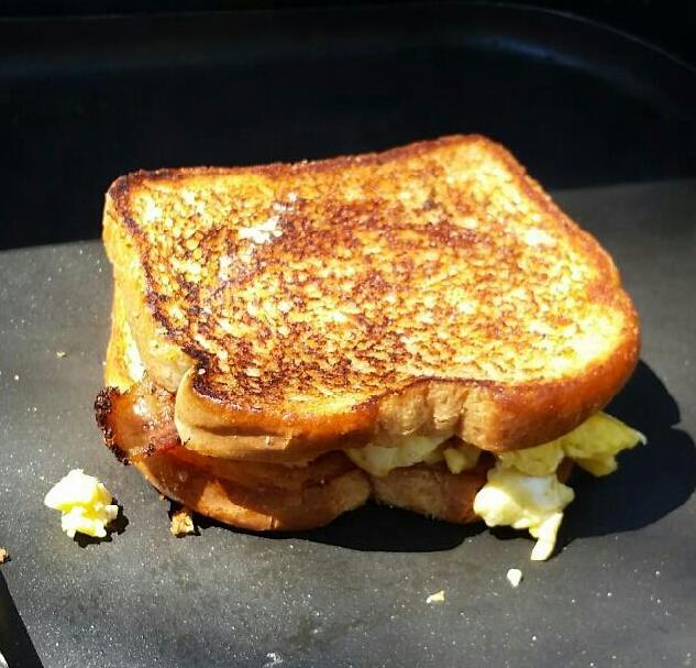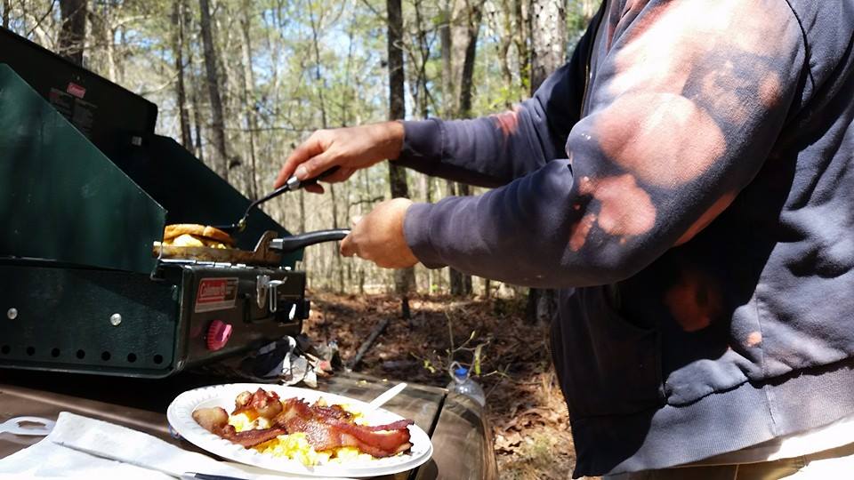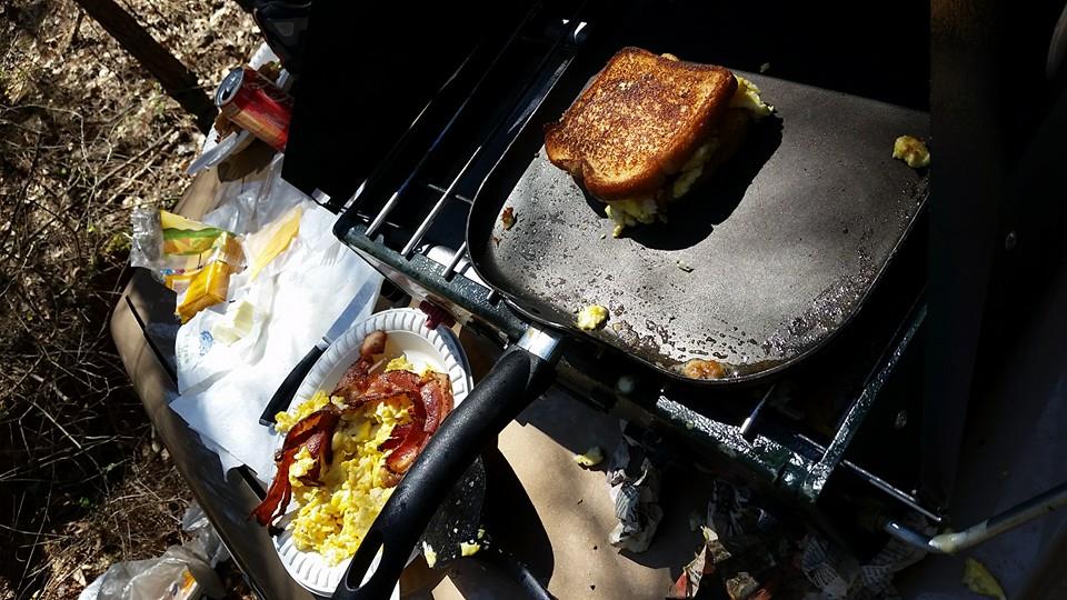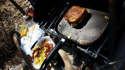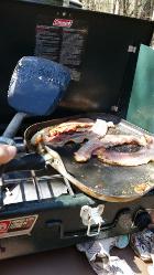 | Sometimes I bring my Coleman propane camp stove out to the digs and make grilled cheese sandwich's . Sometimes I go all out and also have eggs and bacon. In the winter time I bring a coffee perk kettle. |