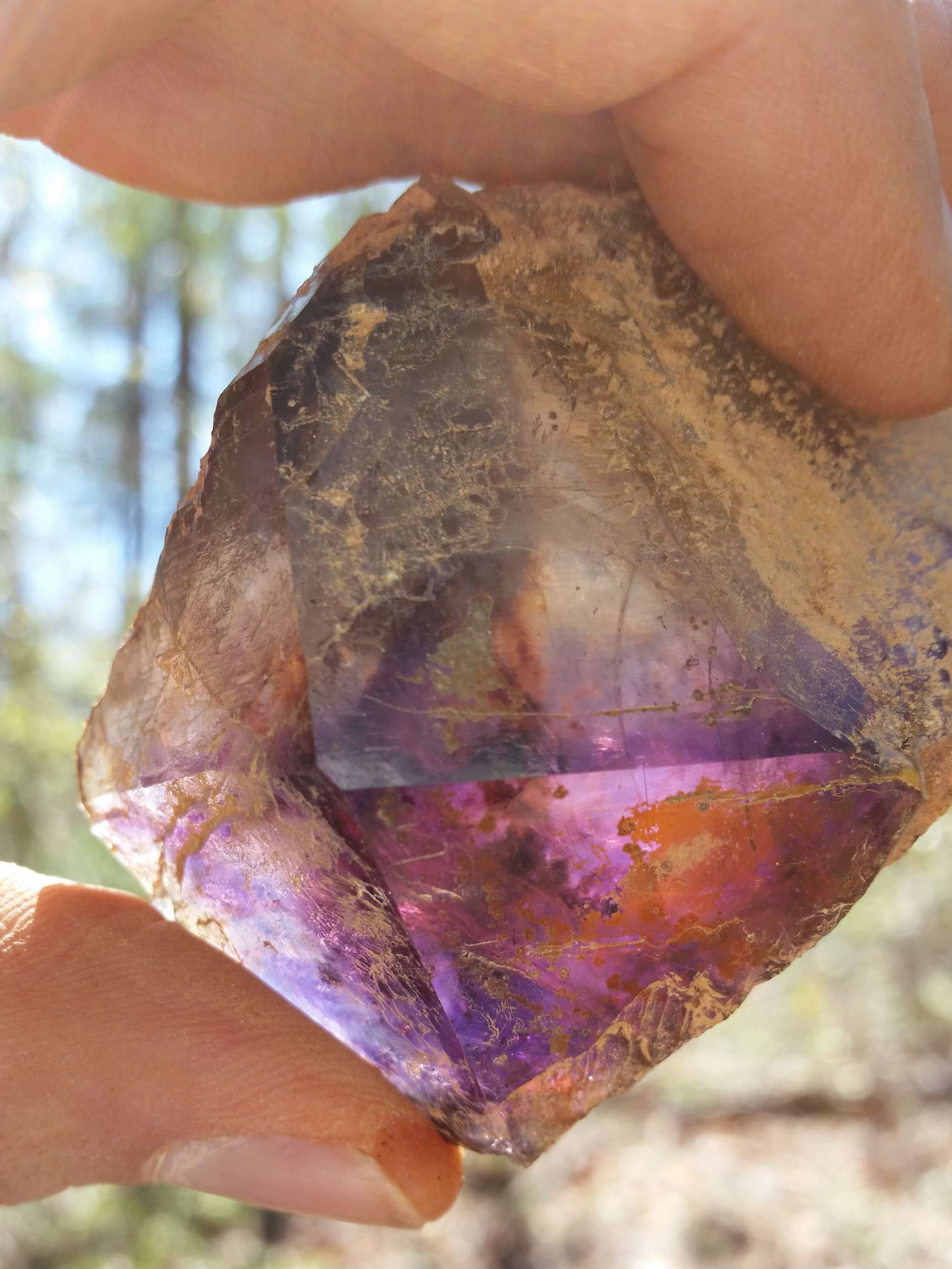 | Georgia has many counties that have amethyst crystal deposits. This project was in Ogelthorpe county,Georgia. There are many places in Ogelthorpe County that have amethyst crystals & the quality of these crystals vary greatly from location to location. At this particular spot we found a few nice whole and complete crystals. Most of the crystals didn't completely form due to a lack of space in the vein. The exterior of the crystals are very bright and shiny and many have a nice thin and colorful iridescent hematite coating on the outer surface. The interior of most crystals had good clarity with a light purple color. Some crystals had a very good medium to dark color amethyst. Most of the crystals were bi-color, having both amethyst and smoky zones. In addition to specimens, some facetable material was found. |