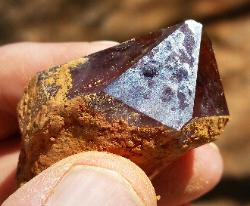 | The crystals shown are freshly dug and still have dirt on them. They also have a hematite coating with an iridescent rainbow of color! The photo above right shows the crystals in-situ in the saprolite matrix. |