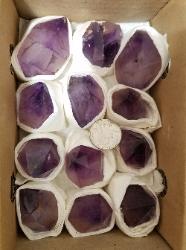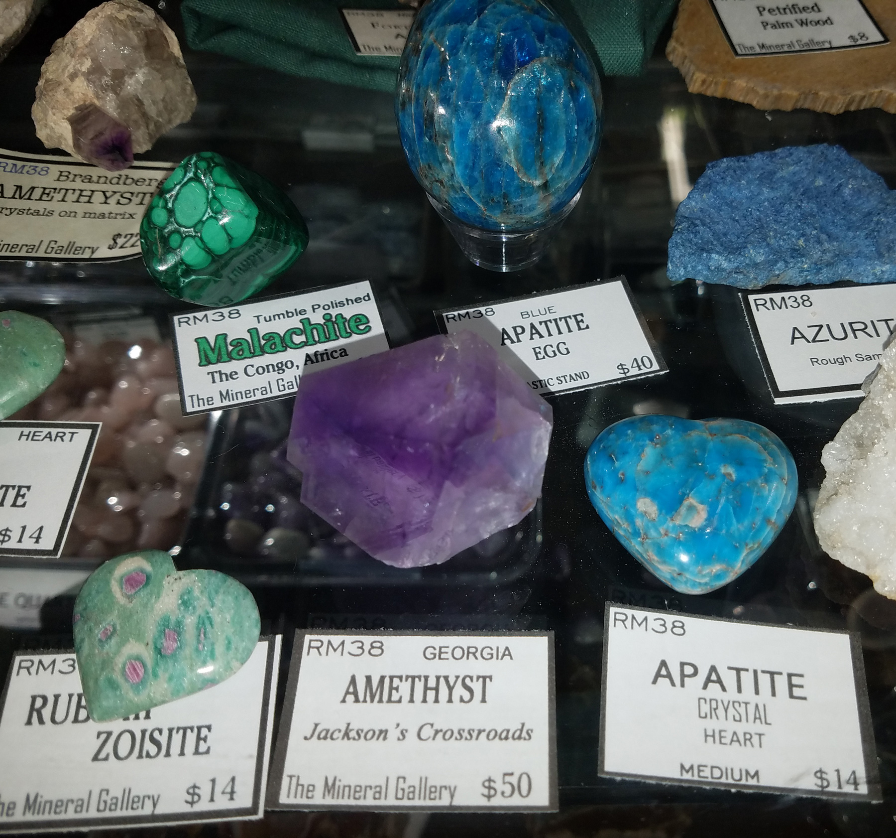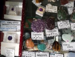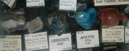 | Here (Left & below) we see Jackson's Crossroads amethyst that I mined back in 2006 when I owned and operated the mine. There is apatite crystal Hearts and eggs at great prices. I just love the deep blue colors! The ruby in Zoisite sold right after I took these pictures. I may have one or two left but I think I sold out of the Ruby hearts within days of sitting them out on the shelf. It's worth clicking to expand the photos as these look great! |