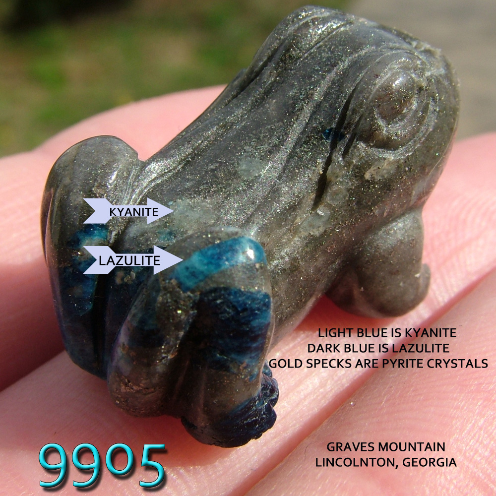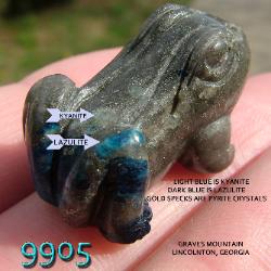 | Shown below is a frog carved from lazulite, kyanite and pyrite in quartzite from Graves Mountain, Lincoln County, Georgia. |