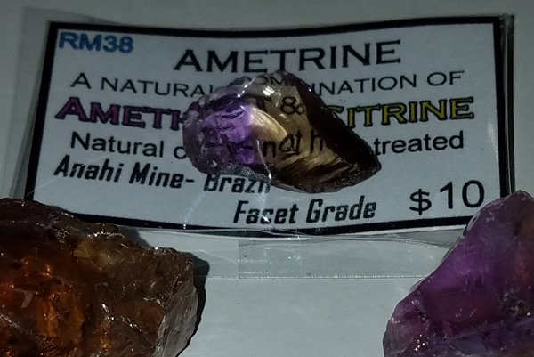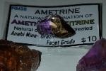 | Above - Center and Right is some Ametrine rough. I actually got this about ten years ago where it sat in storage, and it had sat in a storage unit since the 90's before then by its previous owner. These days you can't get new rough from the ANAHI mine in Bolivia because the owners strictly control the rough material and will only sell cut stones. Ametrine is a natural combination of Amethyst and Citrine. Ametrine, Amethyst & Citrine is commonly made synthetically but this is all natural material that was mined years ago. It's extremely difficult to find natural citrine that hasn't been heat treated. So if you're looking for all-natural material - we've got it! |