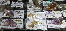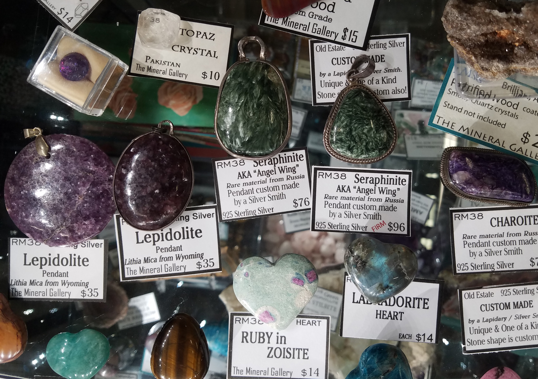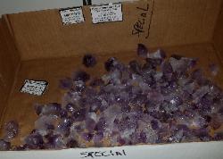 | We have tons of amethyst crystals from all over the world. We even have jewelry points and small "scratch and dent" sale prices of just a buck or two. At left we see just such a bin of amethyst crystals on sale. We also have some cut and faceted amethyst from Jackson's Crossroads (JXR). We also have some pretty unique pendents made from Wyoming Lepidolite and Seraphinite and Charoite from Russia. We was able to get the Lepidolite and Russian Seraphinite and Charoite Silver pendents at an estate sale of a Silversmith who had cut and polished the stones and then set them in hand made silver settings! Photos of these are seen below: |