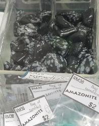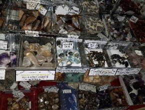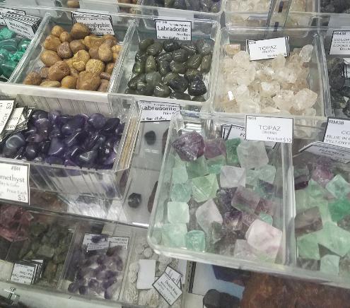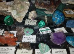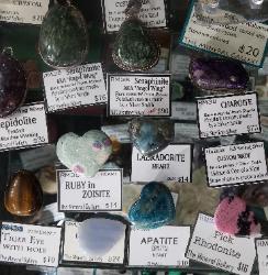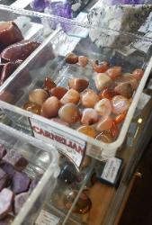 | Below shows just two of the many shelves of tumbled stones! Unakite, sodalite, aventurine, etc |