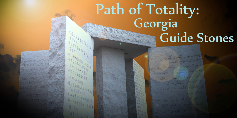 | The Georgia Guide Stones are very mysterious since whomever built it hid behind lawyers and a fake name! It has something to do with the new world order and was built in 1979 and completed and opened in March, 1980 at a time before NWO wasn't even a thing. The graven tablets mention population control, eugenics, a world court and a one world common language! . The Georgia Guide Stones are very mysterious since whom ever built it hid behind lawyers and a fake name! Very mysterious indeed! You can click the Guidestones photo above to enlarge it - all the other photos too. The guide to an Age of Reason lists the things to do and not to do (Guidelines or Principles) in Eight languages. I'll have more info on the guidestones lower on this page, but for now, let's talk about the eclipse! |