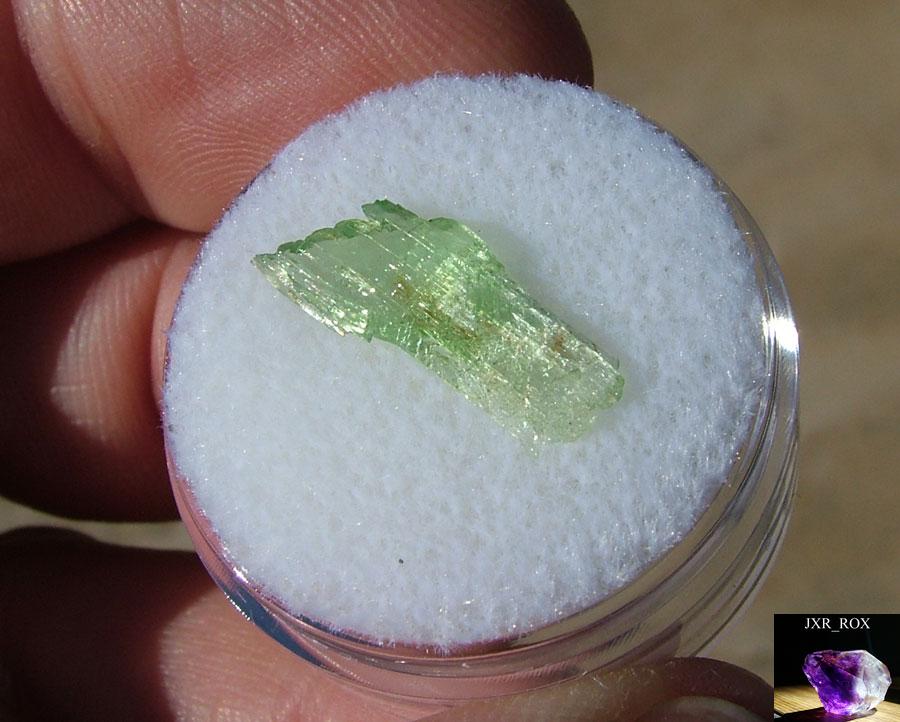 The very small hiddenite crystals range from as low as $15 to $30 for a small but very good crystal such as the one shown above (includes shipping). These are in small white gem jars or magnifier boxes and includes a nice specimen label ( Dixie Euhedrals Brand ). I do have larger Hiddenite Crystals, including some fairly large specimens. The price rises exponentially on the larger crystals. Hiddenite crystals are rare and the larger ones are extremely rare. |