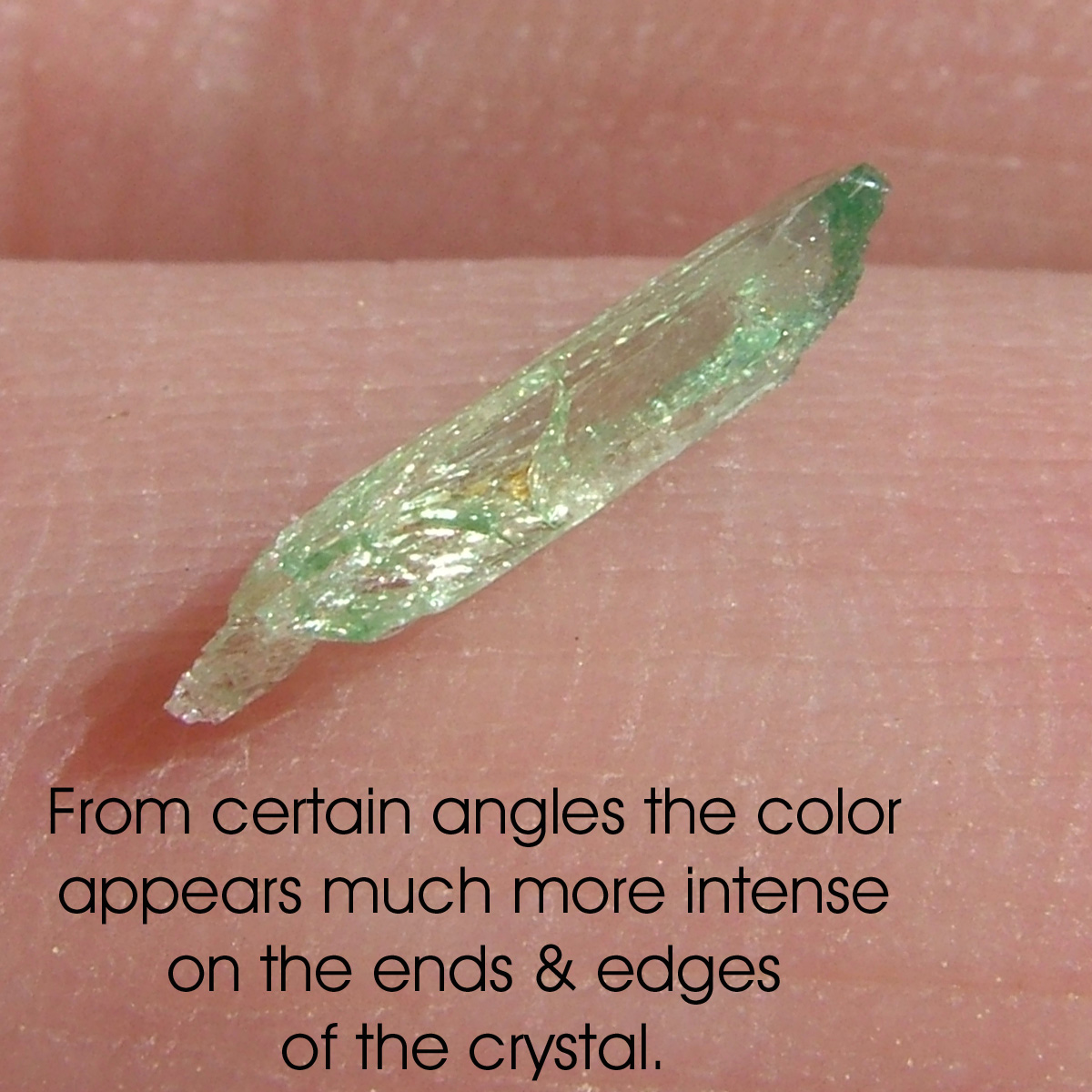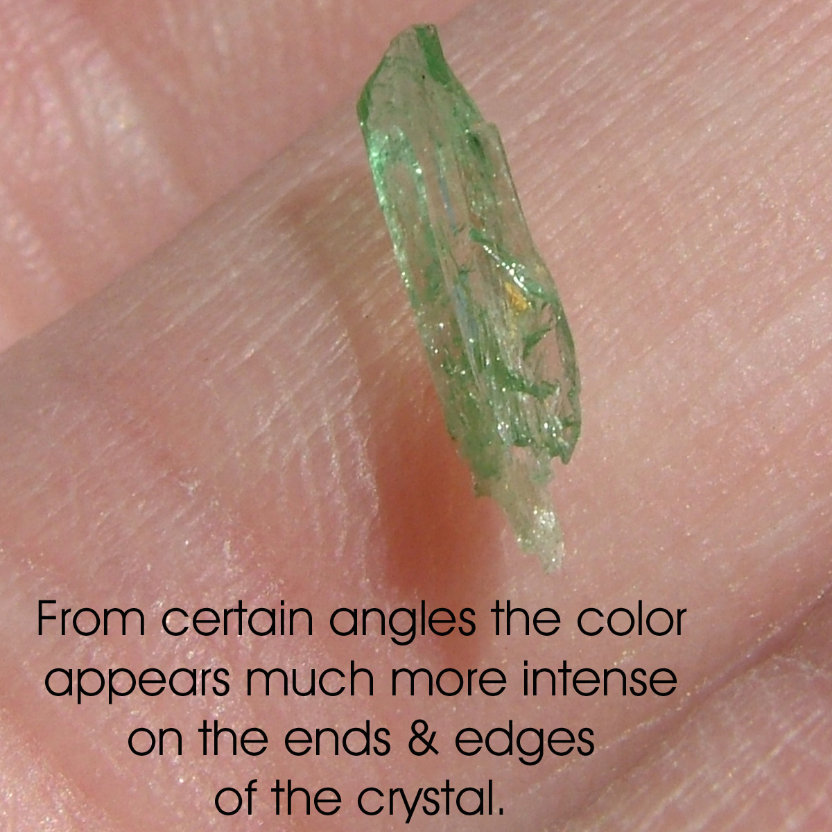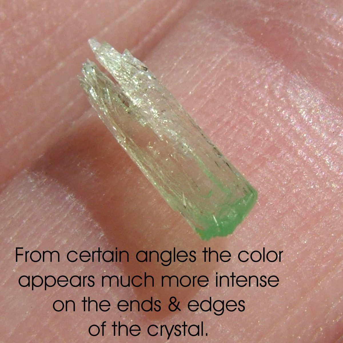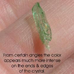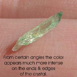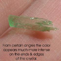 | Genuine Hiddenite crystals are a green variety of Spodumene that gets its color from chromium. Hiddenite and other varieties of spodumene often are pleochroic and exhibit pleochroism. The crystal seems to have different levels and hues of color depending on the angle that the crystal is viewed from. The photos below show marked pleochroism: the green color is much more intense on the ends and edges of the crystal. The way I describe it is that color seems to 'burst' from the ends and edges. |