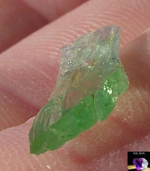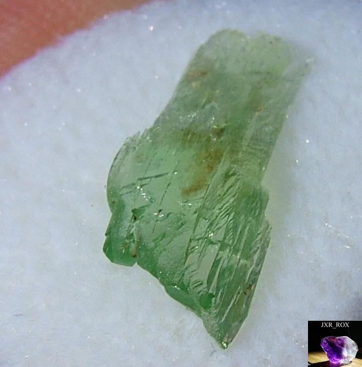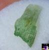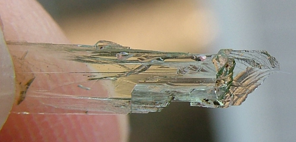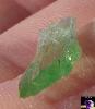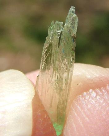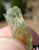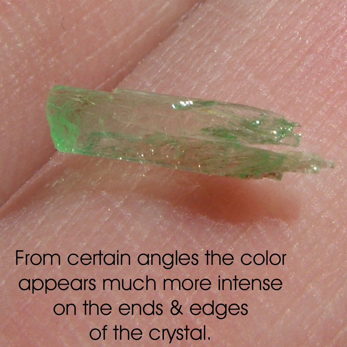 | Genuine Hiddenite crystals are a green variety of Spodumene that gets its color from chromium. Hiddenite and other varieties of spodumene often are pleochroic and exhibit pleochroism. The crystal seems to have different levels and hues of color depending on the angle that the crystal is viewed from. The photos below show marked pleochroism: the green color is much more intense on the ends and edges of the crystal. The way I describe it is that color seems to 'burst' from the ends and edges. |
