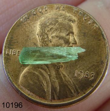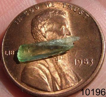 | Below is a fantastic double terminated Hiddenite Crystal from Adam's Farm in Hiddenite, North Carolina. This crystal is tiny but has fantastic form and color. It is shown on a penny for scale. Click to enlarge any photo. |