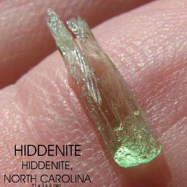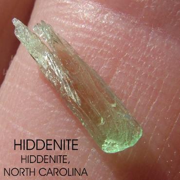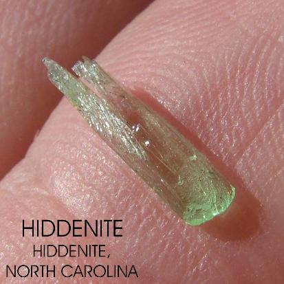 | These are pictures of Hiddenite crystals from Adam's Farm , Hiddenite, North Carolina ( Alexander County ) . The close-ups below show the terminated ends of the double terminated crystal. |