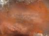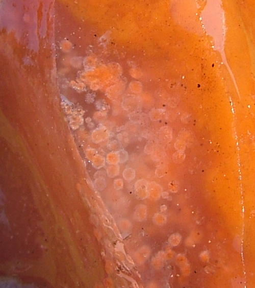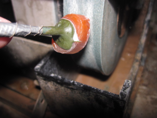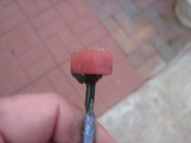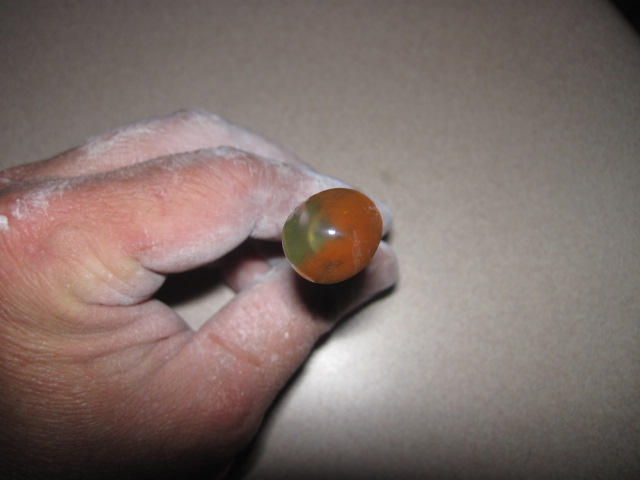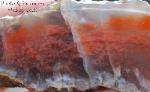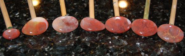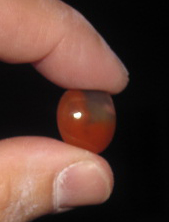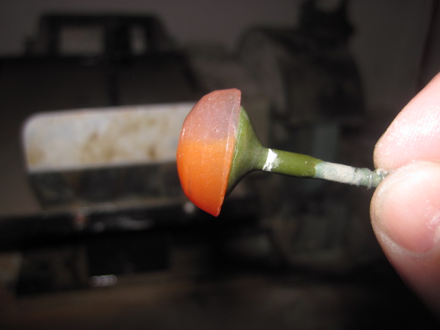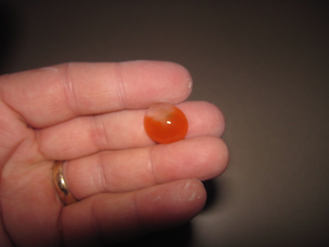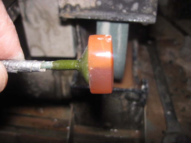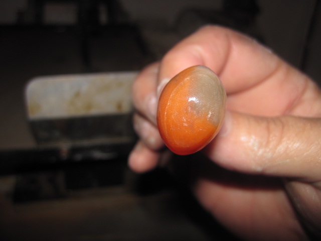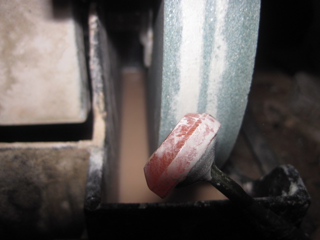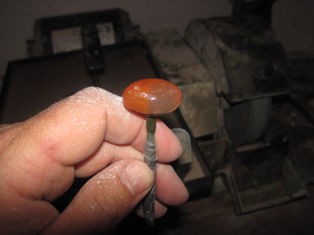 The above photos show how the preform which is glued to a dop stick is ground with a grinding wheel into the domed shape of a cabochon. Next , the finishing touches of smoothing the dome. Lastly, it will get a high polish. The photos below show the prepolish and polish stages and finally the finished paint rock agate cabochon ( Trenton Cherry ).