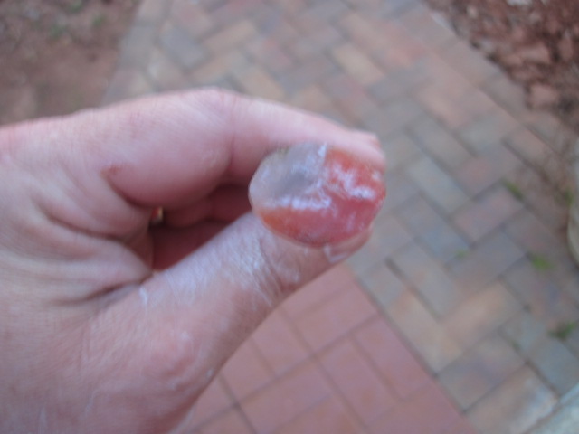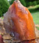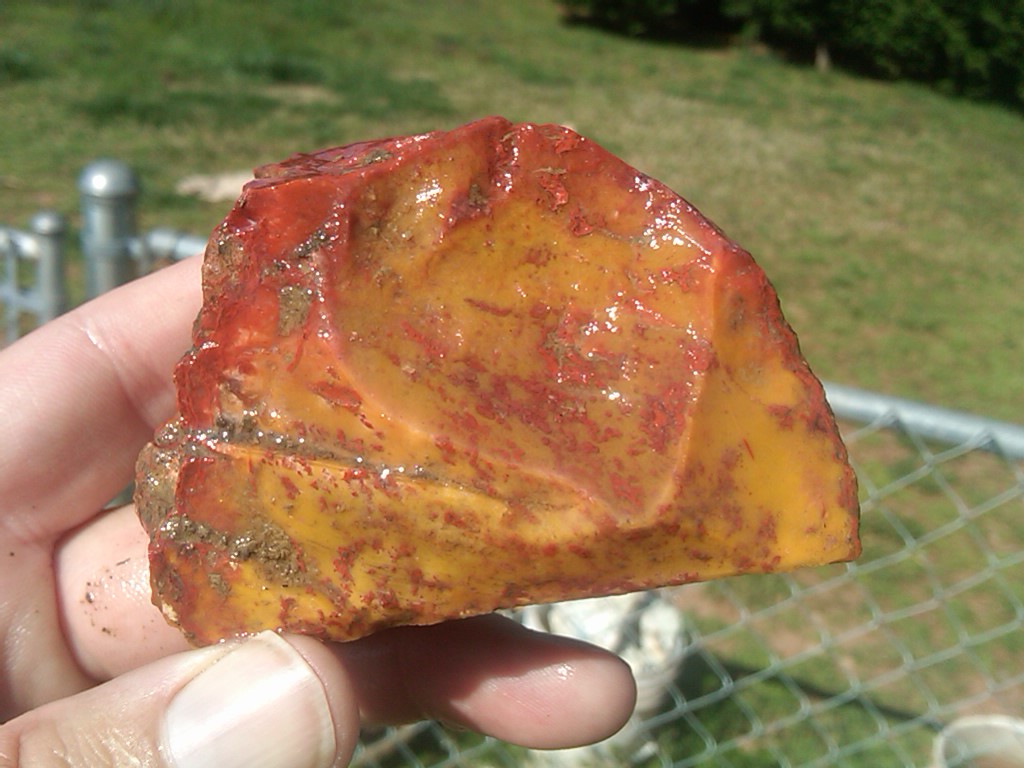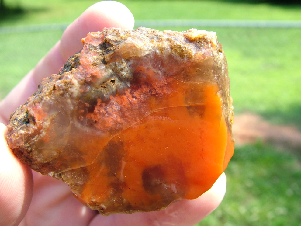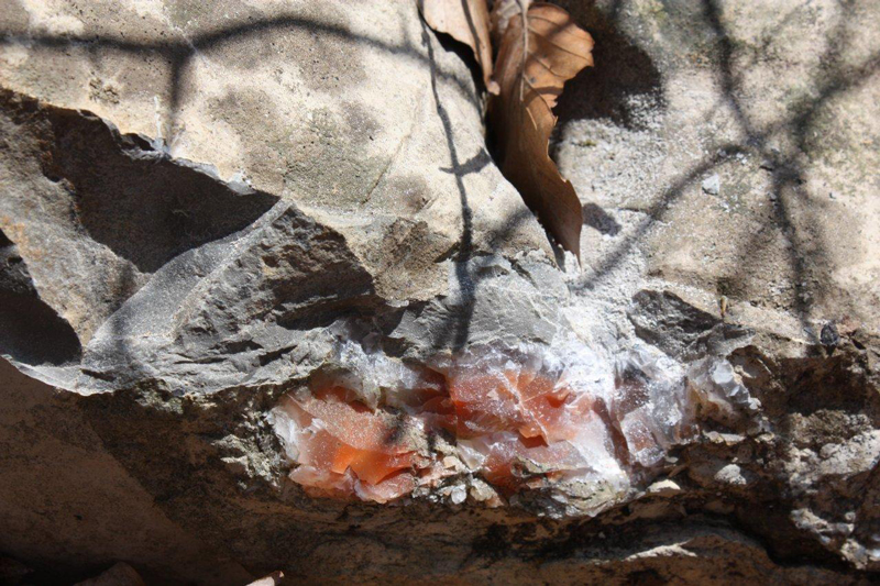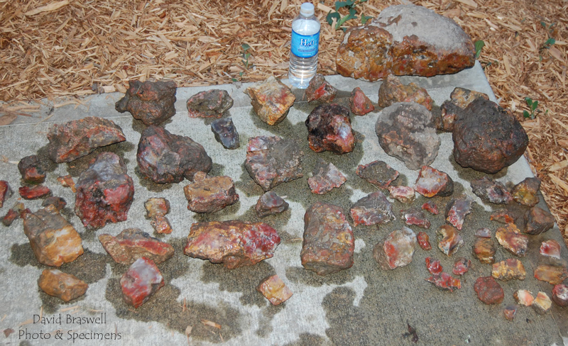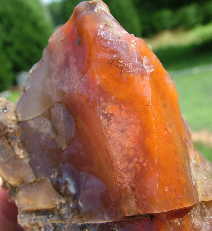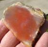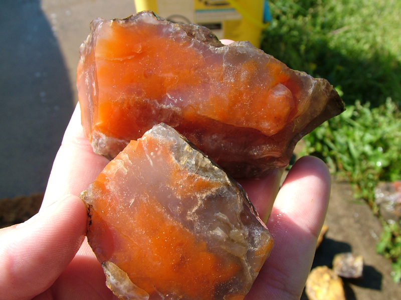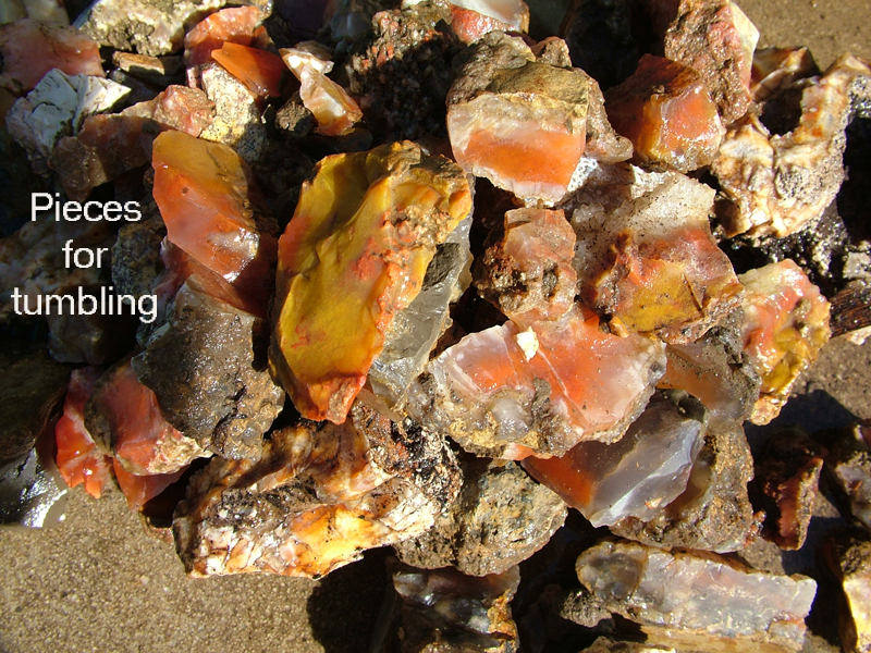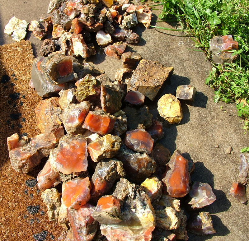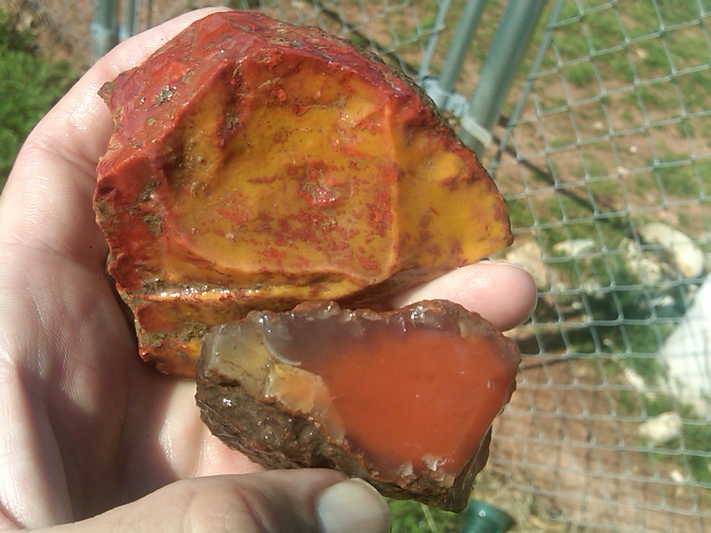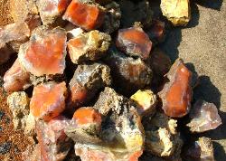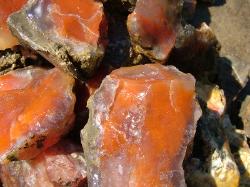 Here the gemmy red carnelian agate is spotted in the wild & is seen as nodules in limestone. At lower elevations you can find these as fracture free nodules that have weathered out of matrix. My chisel wasn't working well on these shown here.