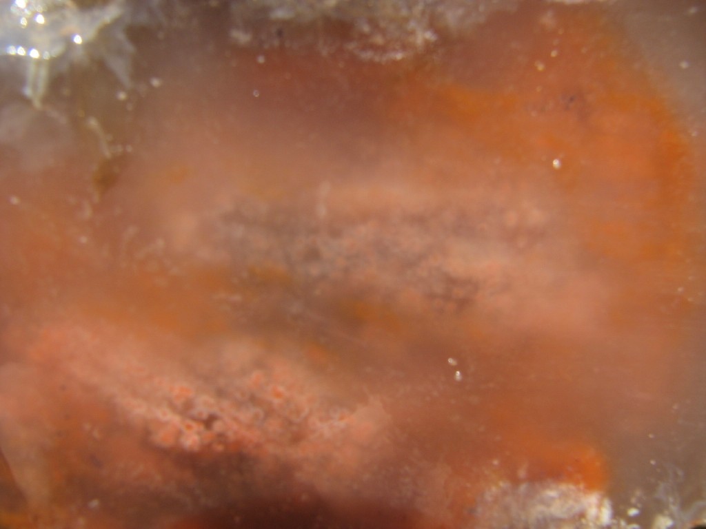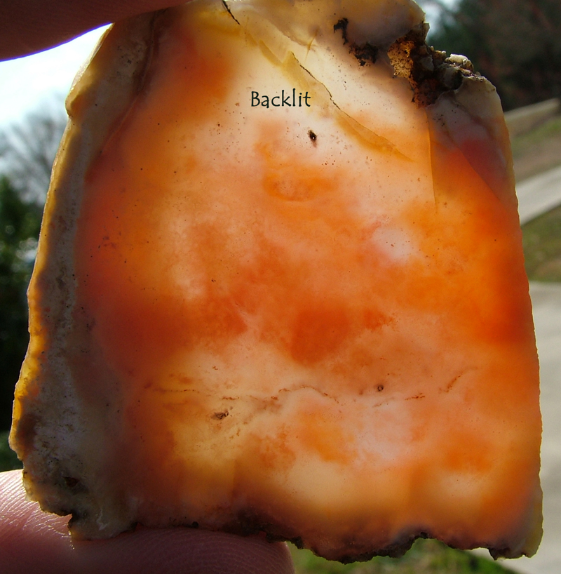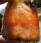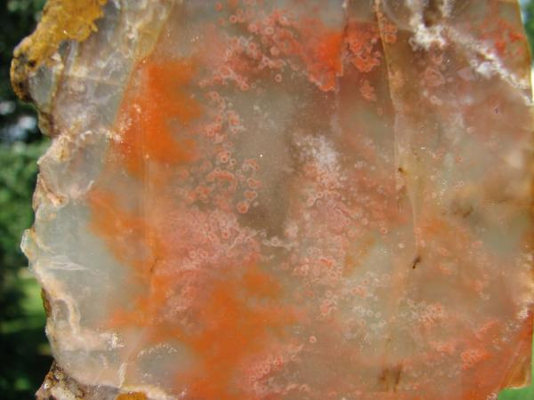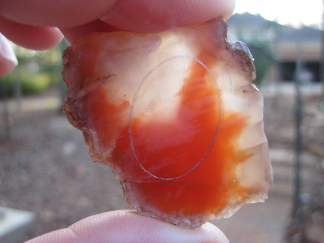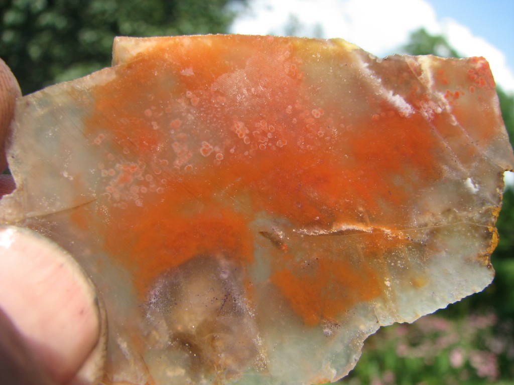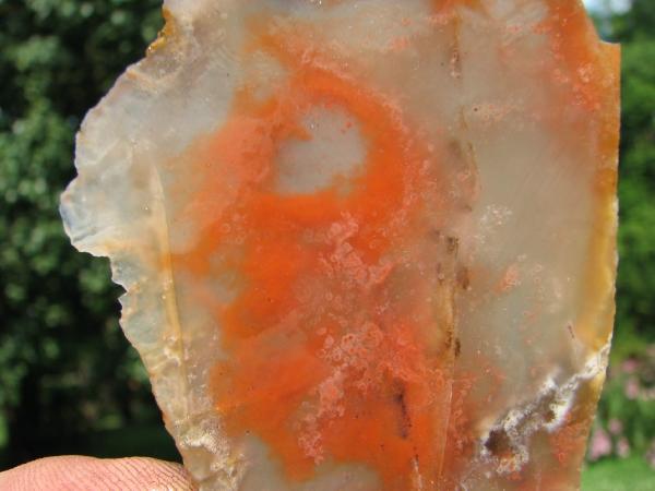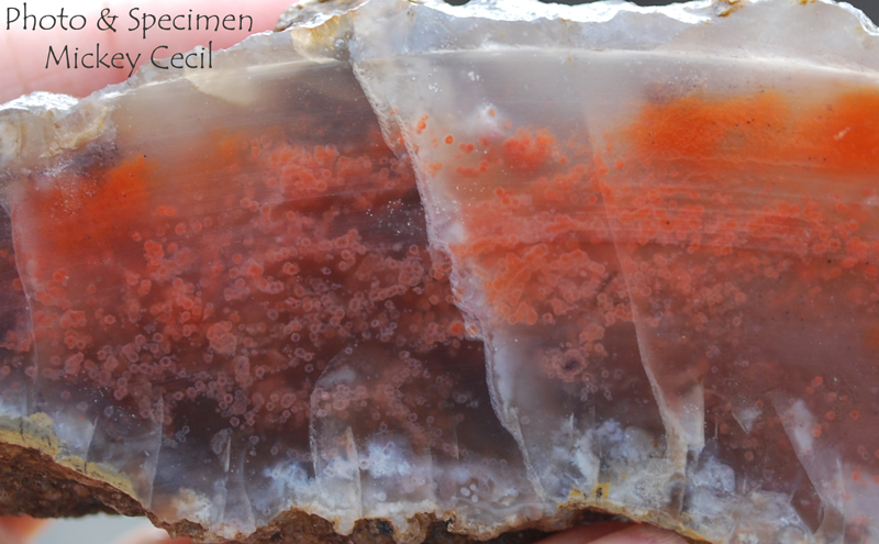 Chris Painter is cutting a cabochon from the Trenton Cherry agate rough found by Bryant North on the March 27, 2010 agate hunt .