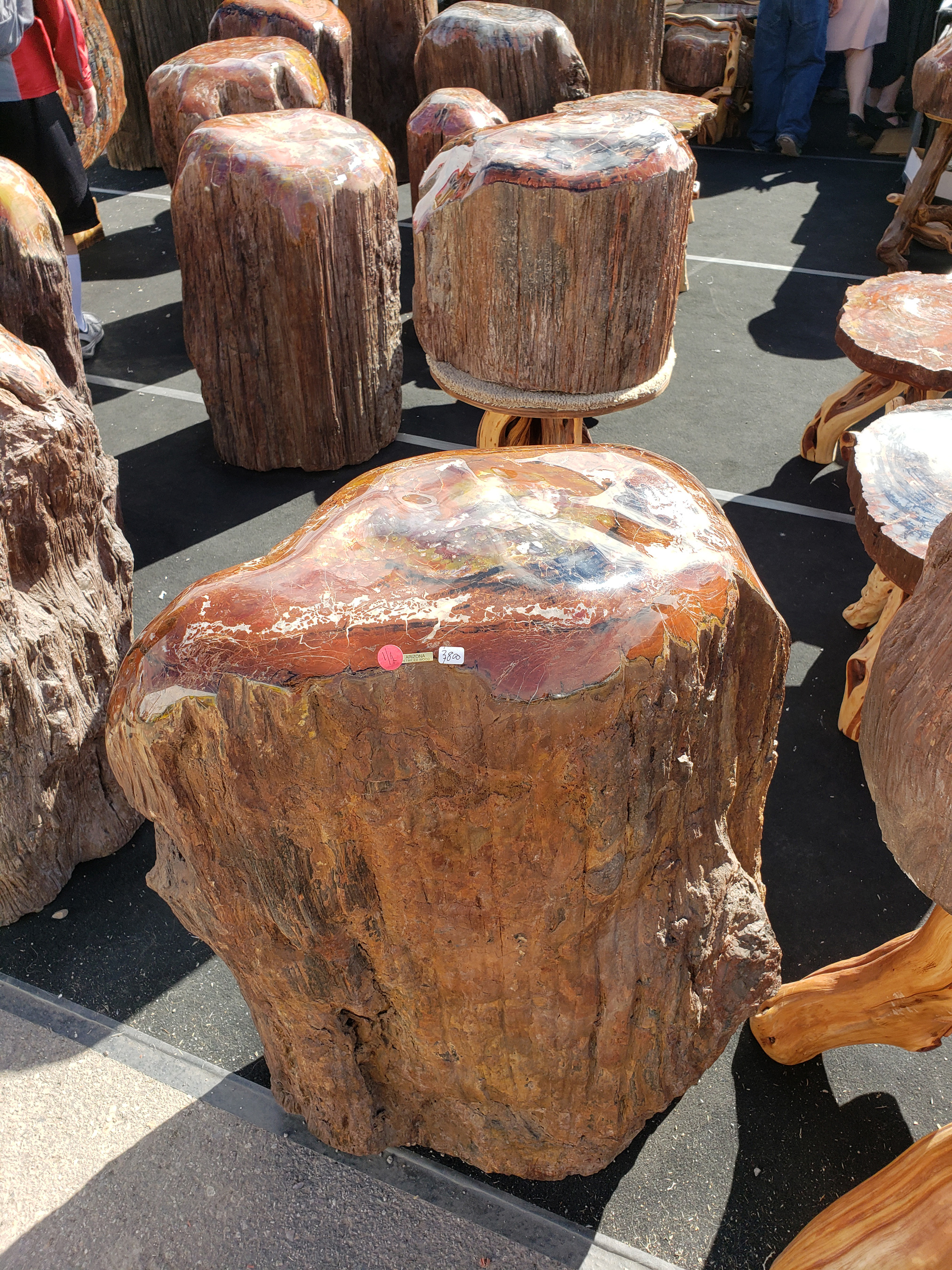 | This year there was a very impressive display of Arizona Rainbow Petrified Wood in the food court. Note the size of the wood next to the people near them - some were 20-foot logs stood on end. Most were two foot to 5 foot long and stood on end with the polished and domed end facing up. Most of these were 4 to 8 thousand dollars. There was one for $1,800 that I really wanted. The one laying down was priced at sixteen thousand. Later in this report I'll have a page showing the digging trips that I went on, and some of this exact type of petrified wood that I found. |