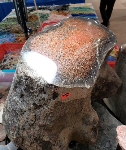 | There were plenty of dinosaur bones for sale, too! These are "gem bone" or lapidary gemstone quality specimens. It will be very worthwhile to click to expand 2X on these 3 photos as the patterns and colors where the bone marrow filled with different colors are an incredible sight to see! The one on the left had a "Reduced" price of $4,500 and that is perfectly reasonable for a specimen of that quality. |