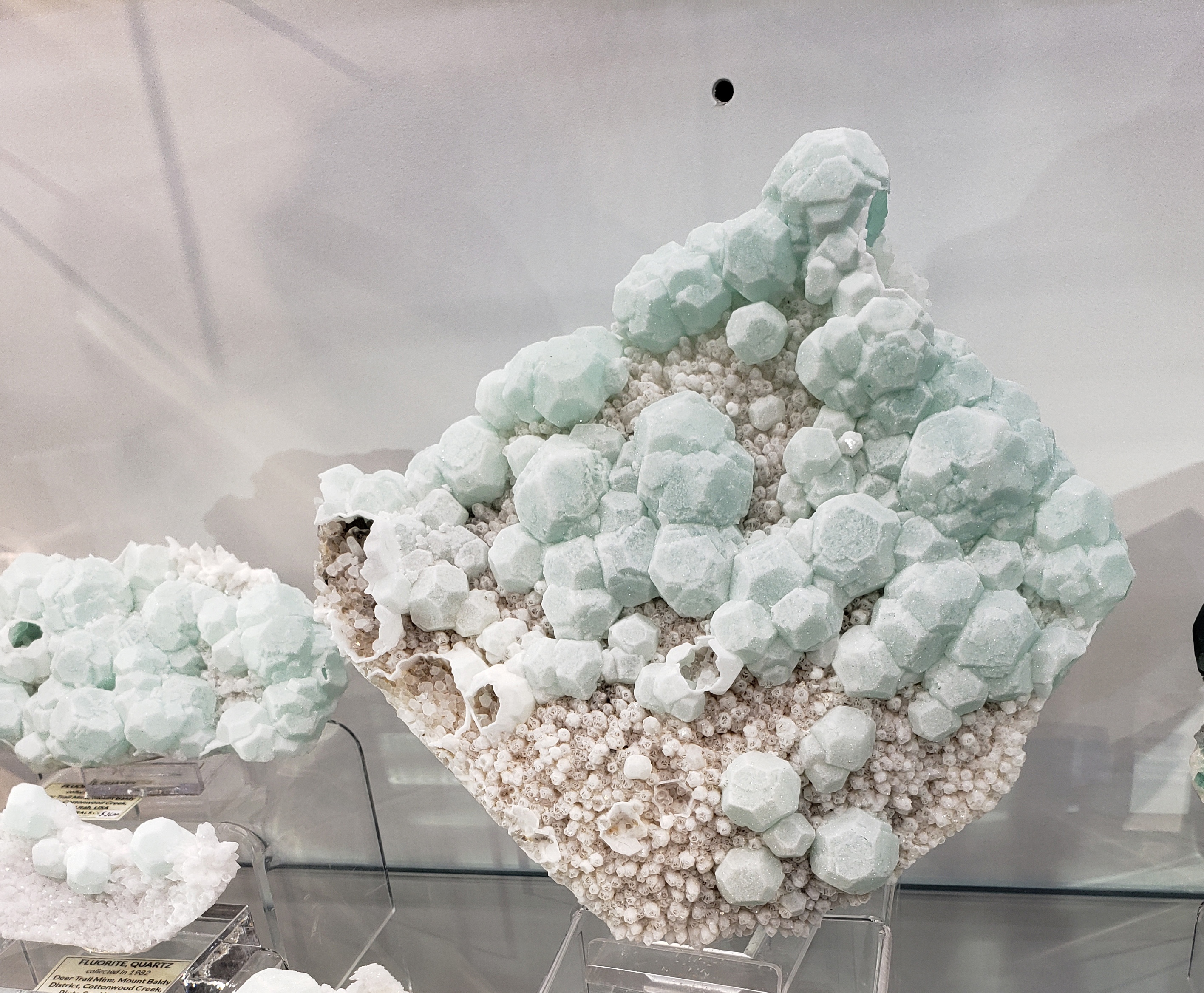 | One of the vendors at The Mineral City show, Spirifier Minerals, had really nice cobaltocalcite crystals (some of which were remarkably transparent!) and also Fluorite Crystals from Mongolia. This is shown immediately above and below. |