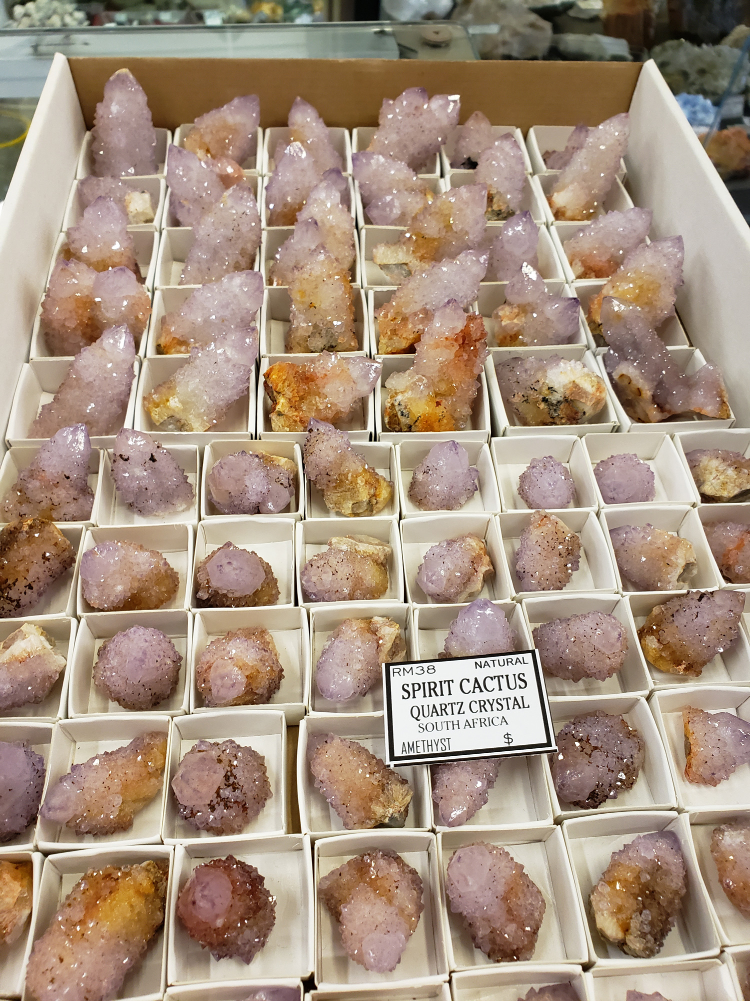 | Also at the Mineral City Show is Paul Botha from South Africa with a selection of minerals from South Africa and Namibia. Paul had some nice amethyst spirit cactus quartz for sale by the flat. |