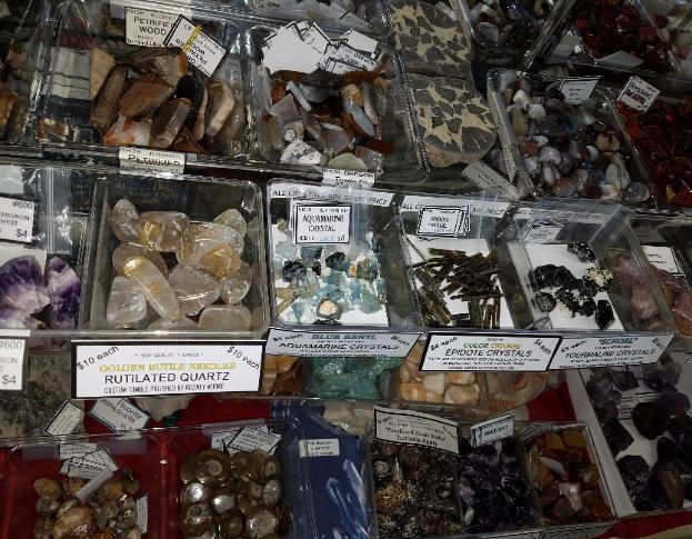 | The photo below shows new crystals added to our rock shop in McDonough, Georgia. We've added some great small aquamarine crystals for only $8 each, New epidote crystals and tourmaline crystals too! (click to enlarge) |